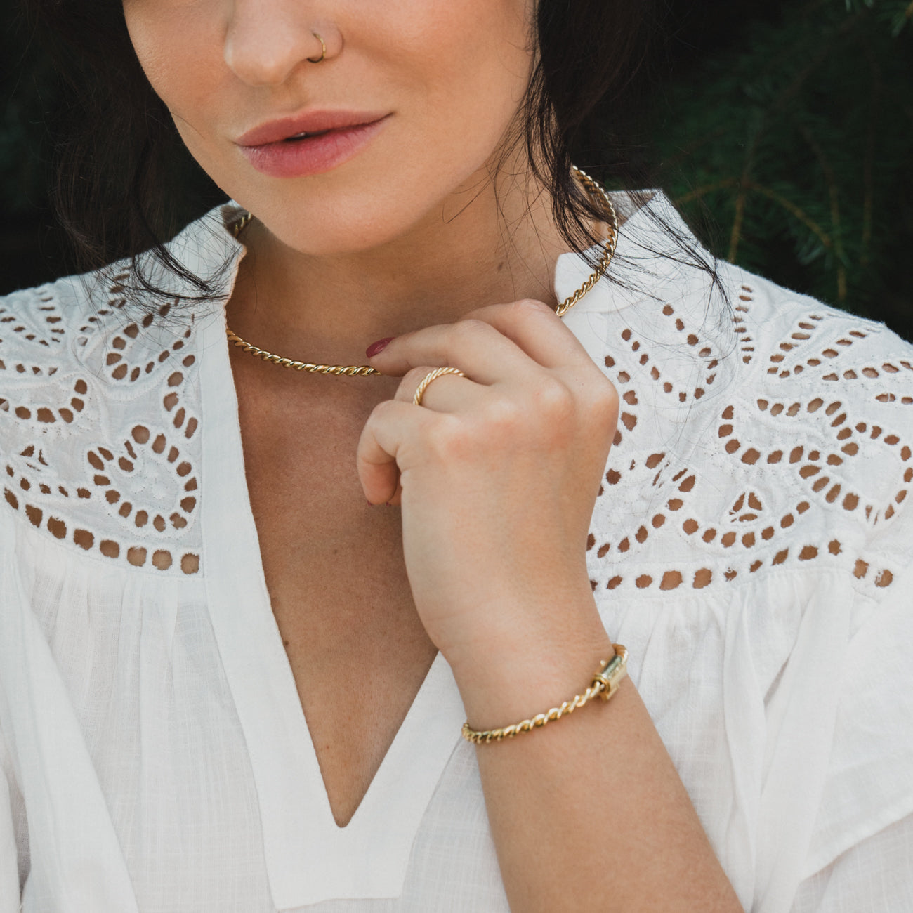 Het is geschikt voor zowel dagelijks gebruik als voor speciale gelegenheden. De gouden tint benadrukt het tijdloze karakter en de natuurlijke glans.